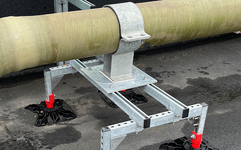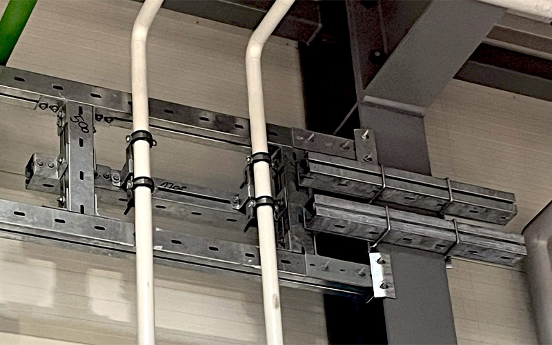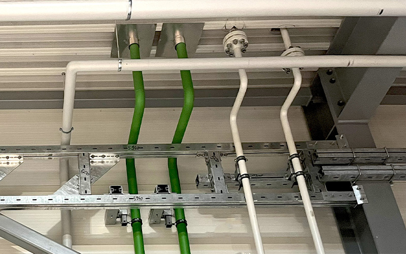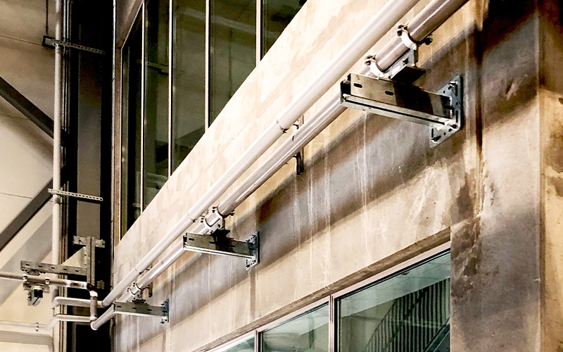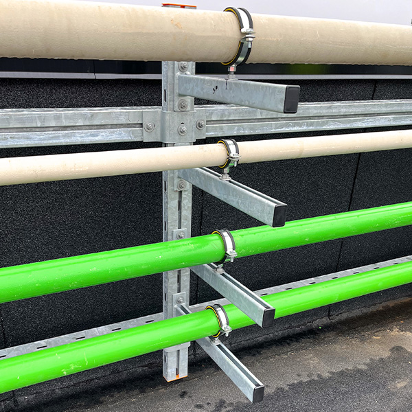 In this project, MÜPRO not only demonstrates flexibility and efficiency in the construction process but also showcases a wide range of products. The total weight of the materials supplied amounts to 59.5 tons. Around 300 of the company’s products are being used – including screw-on pipe clamps, high-performance anchors, support profiles, rail brackets, bracket angles, and system rails in various designs. For example, several hundred meters of MPC system rails 38/40 and 40/60 in hot-dip galvanized versions were installed. The scale marks on the sides and on the slotted side not only facilitated the alignment of fasteners but also ensured easy on-site cutting of the profiles. In addition, the rails are characterized by their high bending stiffness under load. The standard-compliant hot-dip galvanizing protects the material from corrosion. This also applies to the over 400 hot-dip galvanized MPT Q100 support profiles, which are six meters long and 3.5 millimeters thick.